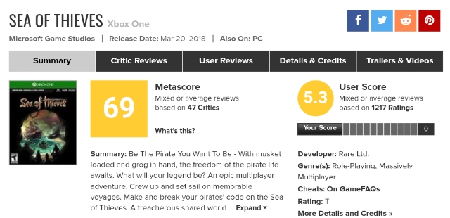 GamesRadar :70As it stands at launch, it’s genuinely good fun with friends, but progressing to Pirate Legend is a long grind. Sea of Thieves needs a lot more briny depth before it’s the amazing voyage we’d hoped for, but so far the great cooperative moments are a good start.
