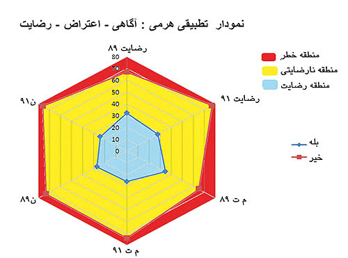 این مدل شامل آمار تطبیقی شاخصههای اطلاع از نرخ مصوب، مشکل در تسویه حساب و رضایت از کیفیت خدمات ارتباطی است که ناحیه آبی رنگ شامل ناحیه رضایت، عدم مشکل مالی و آشنایی با حقوق کاربری است که برای کاربر، خدماتدهنده و ناظر یک محیط ایده آل است؛ همچنین ناحیه زرد رنگ شامل ناحیه نارضایتی است که گویای میزان عدم اطلاع از حقوق نیز میشود و این موضوع نشان دهنده پتانسیل بالای برهم خوردن قاعدههای اقتصادی است؛ در صورتیکه اگر هر یک از این شاخصهها روندي رو به بهبود داشته باشد میتواند به صورت تصاعدی شرایط کلی ضعفهای دیگر شاخصهها را نیز پوشش دهد. ناحیه سرخ رنگ نیز ناحیه تفاضل میزان رضایت و عدم رضایت است که در شرایط خطرناکی قرار دارد.