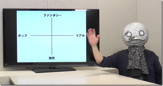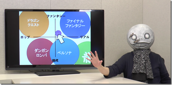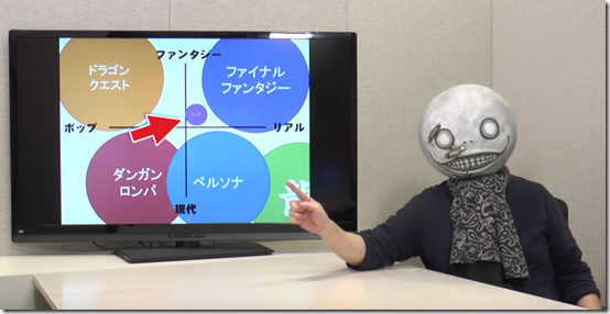 NieR, the games that I make, is located in the Japanese game industry, it would be this tiny part here. That’s the game I make. Caught right between the crevice of Square Enix’s giant titles and Atlus’ wonderful titles, we’re barely making it alive, somehow, and that is the current situation.”