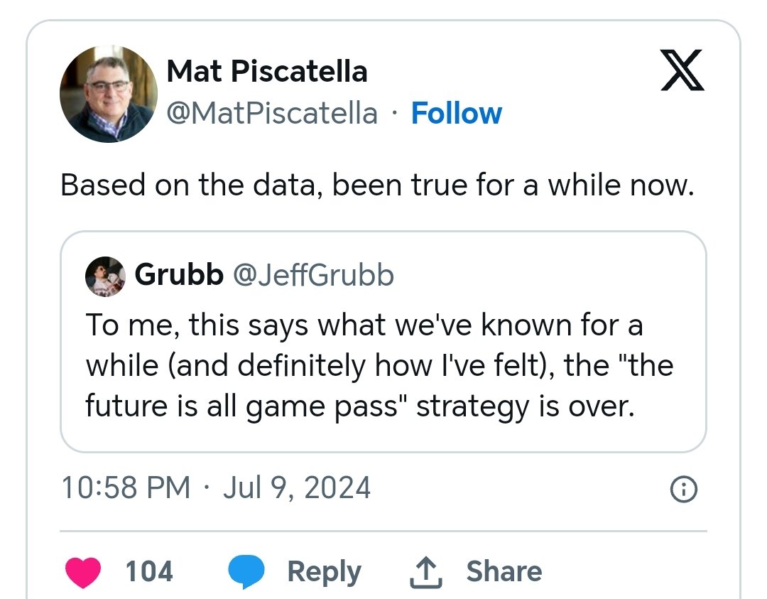 یه چیز جالب اینه ۸۰ درصد کنسول های فروخته شده ایکس باکس سری اس ۳۰۰ دلاری هستن ! بعد مایکروسافت انتظار داره افرادی که کلا ۳۰۰ دلار پول کنسول دادن و حتی حاظر نشدن کنسول قدرتمند ۵۰۰ دلاریش بخرن سالی ۲۴۰ دلار تقریبا معادل قیمت کنسولشون پول سرویس بدن ! اصلا ارزش گیم پس به این بود که اشتراکش میذاشتن داخل پفک یک دلاری !!! به زودی گیم پس هم میره زباله دان تاریخ