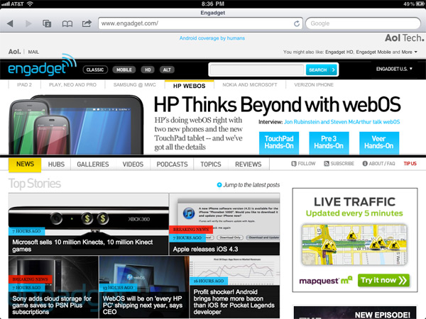 در استفاده روزمره و کلی، متوجه شدیم که مرورگر به طرز محسوسی سریع تر و پاسخگو تر نسبت به iPad قبلی است، که با توجه به اینکه تجربه مرور وب با تبلت ها هنوز کاملا به پای لذت تجربه وب با دسکتاپ نمی رسد می تواند خبر خوبی باشد. با این سخن، ۲ iPad به میزان زیادی خود را به سرعت و روانی که شما را بر روی لپ تاپ خود سراغ دارید نزدیک کرده است — و آشکار است که متخصصان اپل ، زمان و تلاش زیادی را برای تحقق این امر صرف نموده اند.