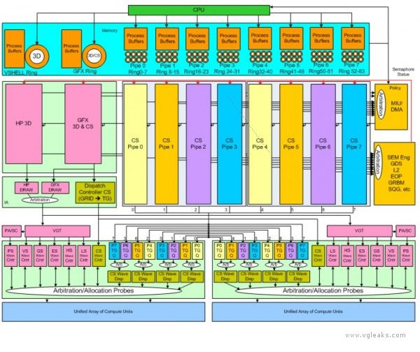 همونطور که میدونیم GPU کنسول PS4 از خانواده " لیورپول " و سری نسل جدید پردازنده های AMD هست . اخرین خبر هایی که از این GPU در وب منتشر شده ، نشان دهنده تغییراتی جزئی در GPU کنسول هست که هنوز مشخص نیست تا چه حدی میتونه درسته باشه ! طبق این خبرهای ، بلوک های عقبی و جلویی ، هسته های سایه زنی بدون هیچ تغییری باقی موندن . اما برخی اضافات جدید با هدف بهبود قابلیت ها و بازده حجم محاسبات کاری به GPU اضافه شدن . GPU قدرتمند کنسول PS4 میتونه محاسبات چندگانه رو میتونه با حلقه های و لوله های ( pipes ) متفاوتی فراهم کنه تا بتونه کاری کنه که تمام منابع بین GPU تقسیم بشن . این خط لوله های میتونن به صورت غیر همزمان عملیات و دستورات پردازشی simulteneous رو حاسبه کنن . مثلا دیاگرام زیر تعداد خط لوله ها ( pipelines ) و صف ها رو به خوبی تو معماری ردازنده ( شایعه ) نشون میده .